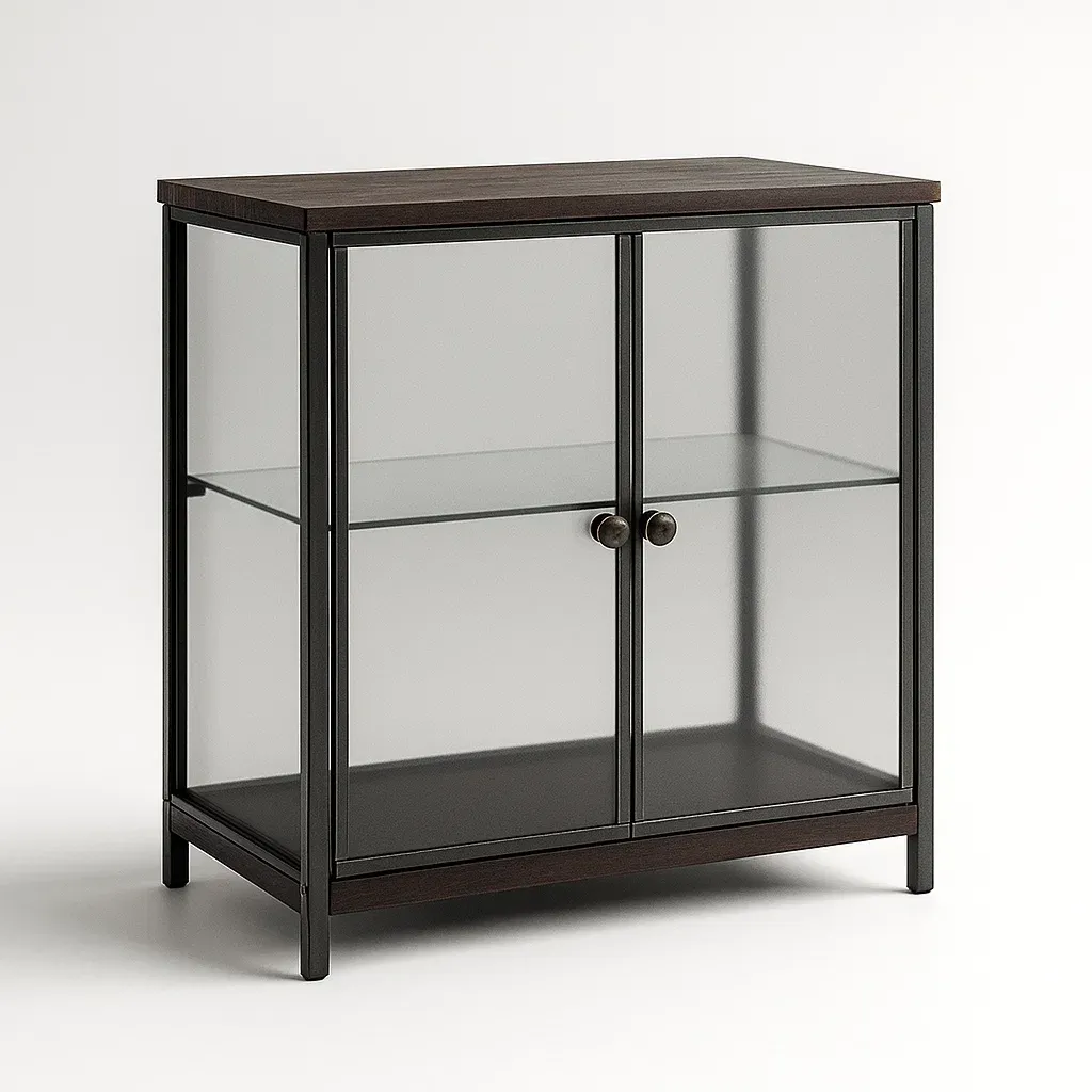 Mobile contenitore in metallo e vetro satinato con superficie in legno composito